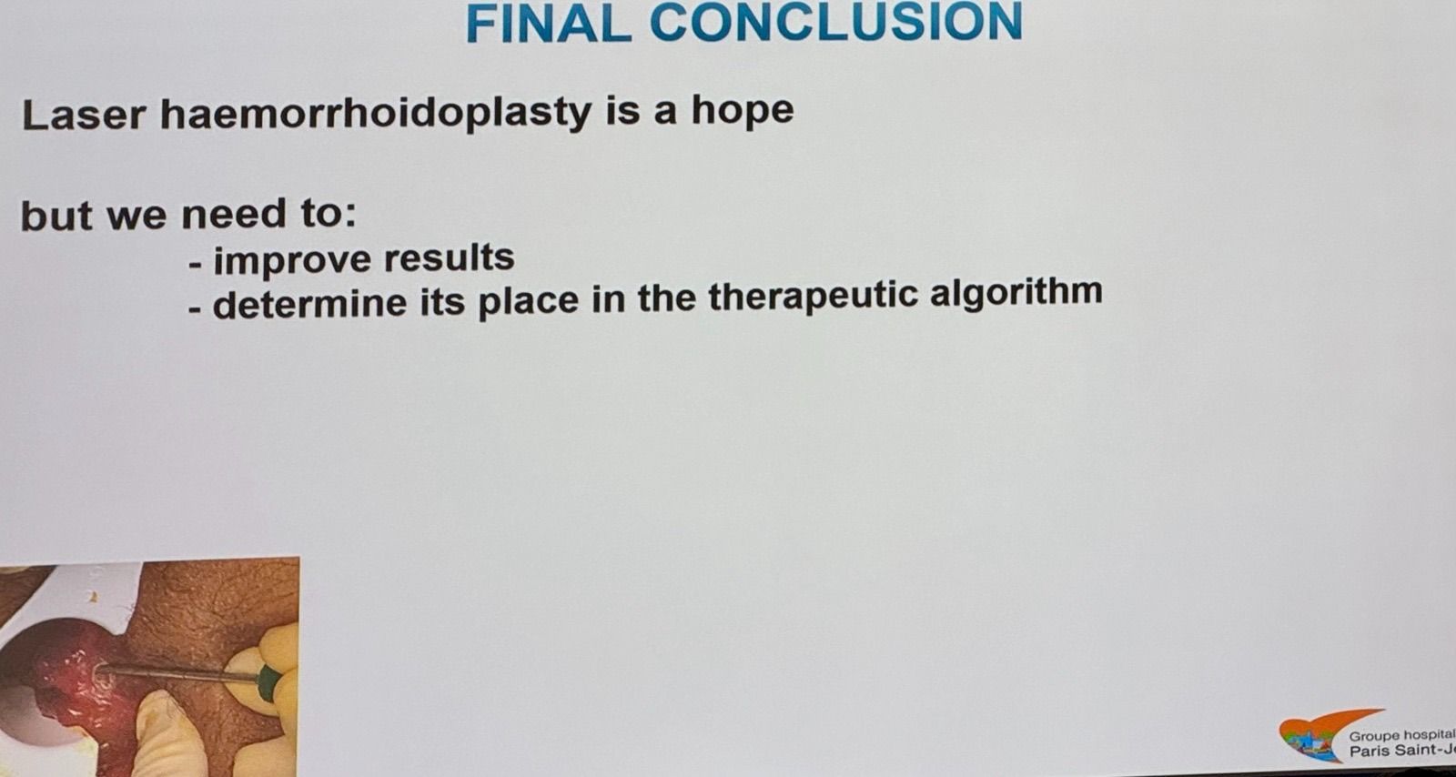 Μεταξύ άλλων, στο συνέδριο παρουσιάστηκαν ενδιαφέρουσες μελέτες για τη θεραπεία των περιπρωκτικών παθήσεων (περιεδρικών συριγγίων, αιμορροΐδων, κύστης κόκκυγα και ραγάδων) με πολύ αισιόδοξα συμπεράσματα για τις δυνατότητες που προσφέρει η τεχνολογία των χειρουργικών laser για αμεσότερη, λιγότερο τραυματική και πιο αποτελεσματική αντιμετώπιση των εν λόγω παθήσεων.